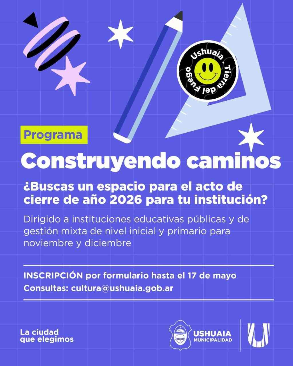 La Municipalidad de Ushuaia, a través de la Secretaría de Políticas Ambientales, Culturales y Educativas, abre las inscripciones al programa “Construyendo Caminos”, iniciativa que pone a disposición el Centro Cultural Esther Fadul para los actos de egreso de las instituciones de nivel inicial y primario.