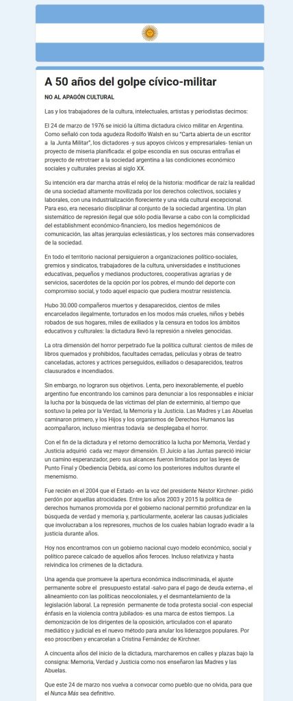 La solicitada remarca el rol central del arte como herramienta de reflexión, denuncia y construcción simbólica. En esa línea, subrayan que la cultura no es un campo aislado, sino un espacio clave en la disputa por el sentido de la historia y la defensa de los derechos humanos.