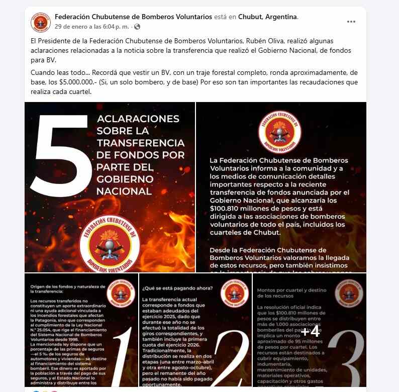 Con un posteo en Facebook, la Federación Chubutense de Bomberos Voluntarios aclaró detalles sobre la reciente transferencia de fondos anunciada por el Gobierno Nacional, que alcanzaría los $100.810 millones y está dirigida a las asociaciones de bomberos voluntarios de todo el país, incluidos los cuarteles de Chubut.