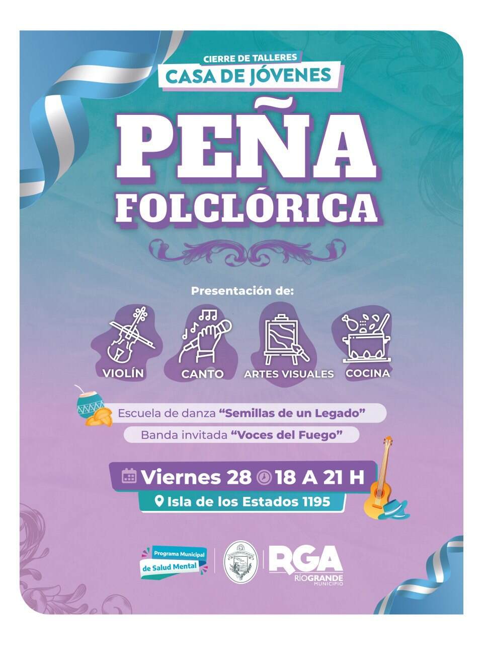 El Municipio de Río Grande llevará adelante el cierre anual de los talleres de Casa de Jóvenes con una Peña Folclórica abierta a la comunidad. La propuesta tendrá lugar el viernes 28 de noviembre, de 18 a 21 horas, en las instalaciones de Isla de los Estados 1195.