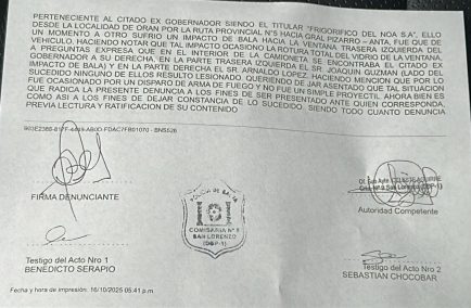 El denunciante aclaró expresamente que el impacto fue ocasionado por un disparo de arma de fuego y que "no se trató de un simple proyectil". Afortunadamente, ninguno de los ocupantes resultó herido.