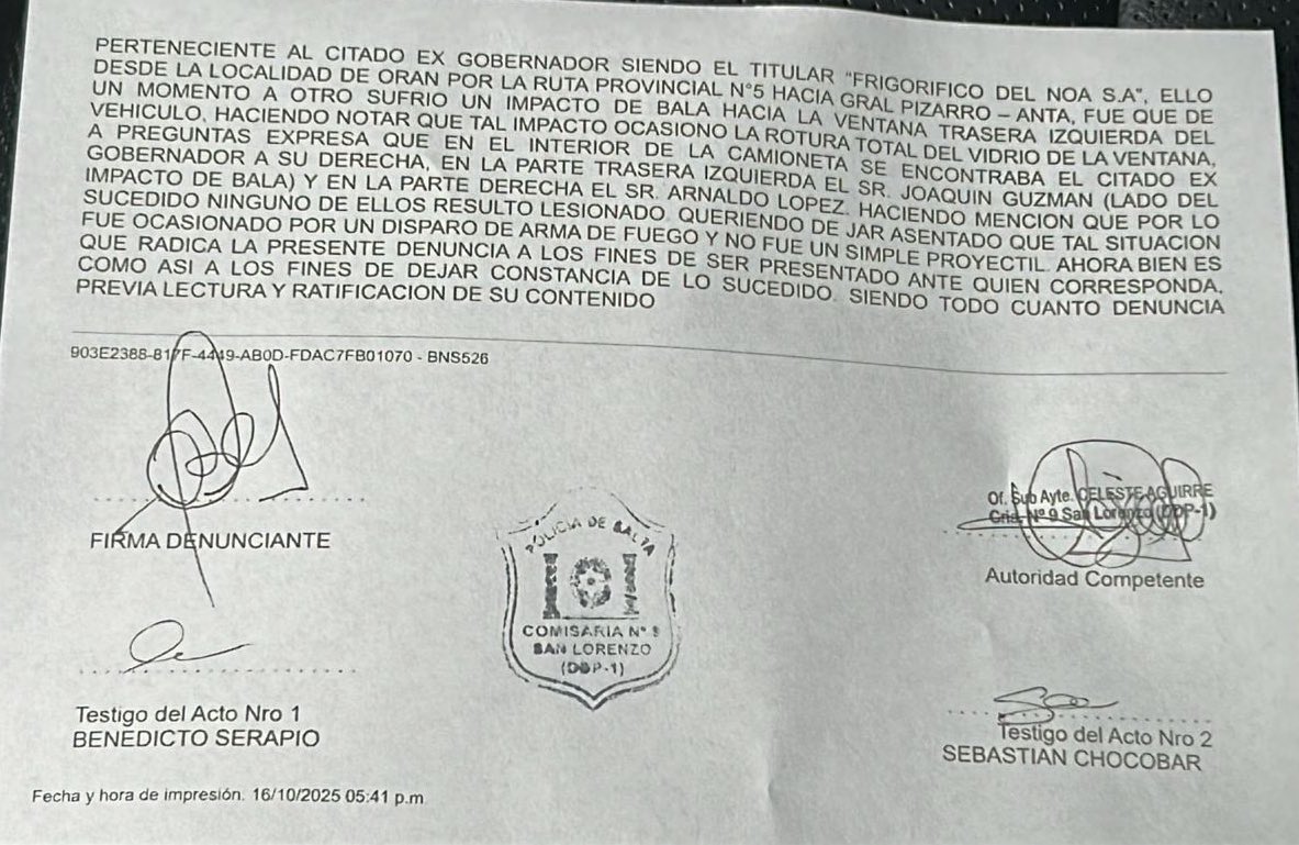 La camioneta en la que viajaba el exgobernador de Salta y actual candidato a senador nacional, Juan Manuel Urtubey, recibió un impacto de bala en plena circulación, de acuerdo a una denuncia policial.