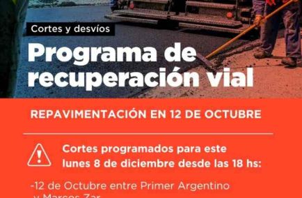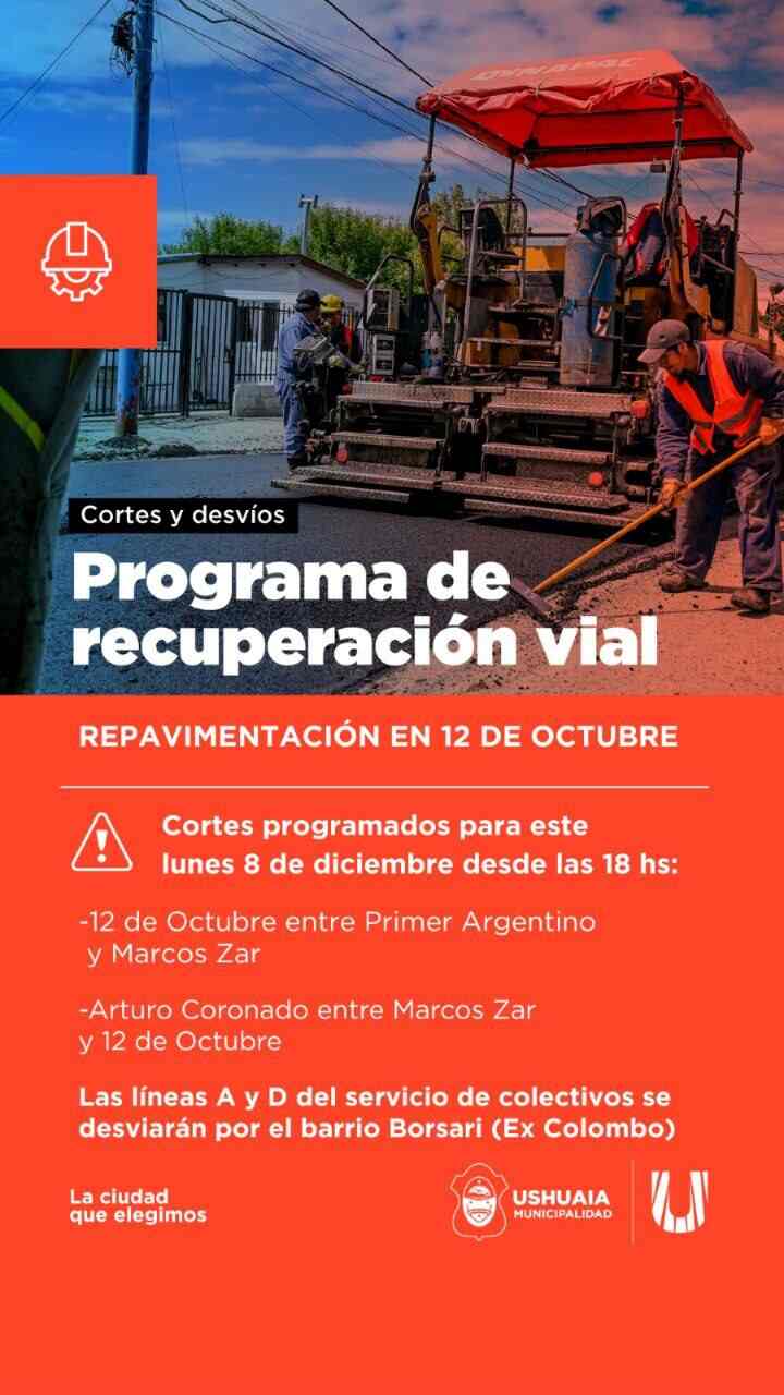 La Municipalidad de Ushuaia informa a vecinos y vecinas que en el marco del Programa de Recuperación Vial que lleva adelante la Secretaría de Planificación e Inversión Pública en distintos sectores de la ciudad, durante el lunes 8 de diciembre se realizará un esquema de cortes de calle previos a la repavimentación de 12 de Octubre la cual tendrá lugar el día martes 9.