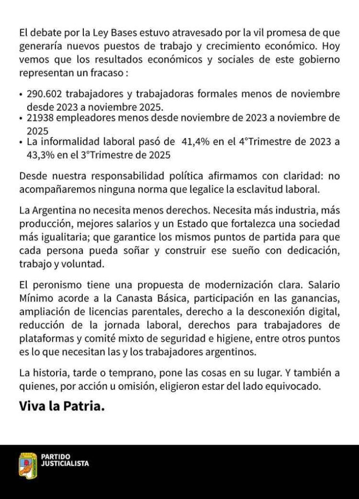 A la vez crítico con los legisladores que acompañaron la iniciativa y los acusó de votar en contra de los principios históricos del movimiento. “Quienes votaron esta reforma lo hicieron contra la doctrina histórica de nuestro movimiento, contra la justicia social y contra quienes dicen representar”, expresó el comunicado. Y remarcó: “El peronismo nació para ampliar derechos, no para convalidar su eliminación; nació para dignificar el trabajo, no para convertirlo en esclavo”.