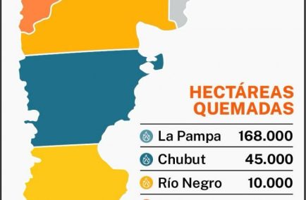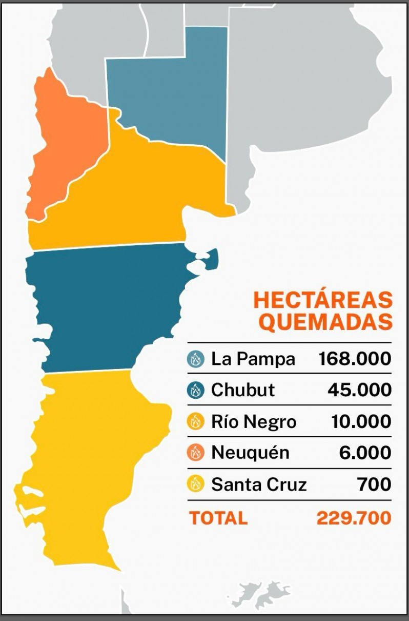 Relevaron que en ese período se quemaron más de 168.000 hectáreas en La Pampa, 45.000 en Chubut, 6.000 en Neuquén, además de 10.000 en Río Negro y 700 en Santa Cruz, lo que eleva el total regional a casi 230.000 hectáreas afectadas.