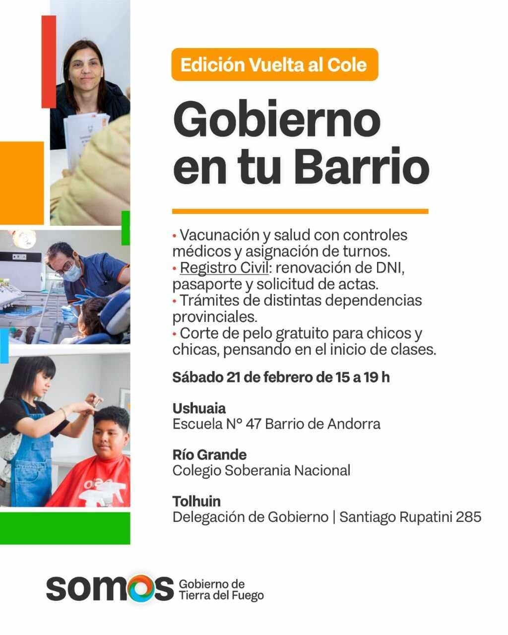 El Gobierno Provincial realizará una nueva jornada del programa Gobierno en tu Barrio, en esta oportunidad con una edición especial denominada “Vuelta al Cole”, pensada para acompañar a las familias fueguinas en el inicio del ciclo lectivo.