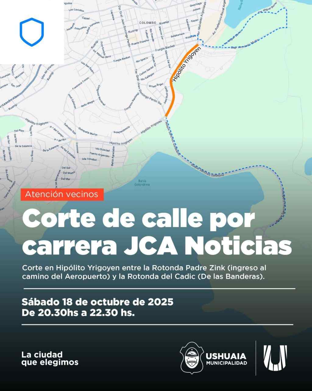 La Municipalidad de Ushuaia informa a la comunidad que este sábado 18 de octubre se realizará un corte temporal de tránsito con motivo de la carrera nocturna “JCA Noticias”.