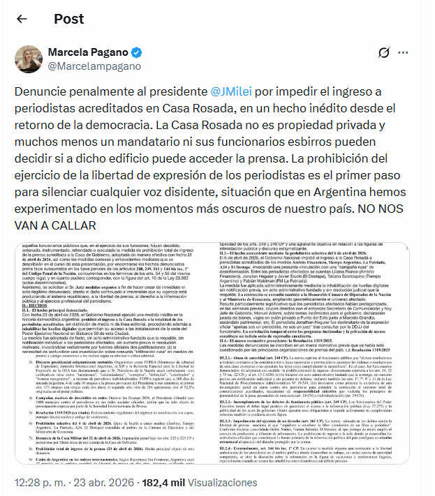 La diputada nacional Marcela Pagano denunció penalmente al presidente Javier Milei por impedir el ingreso de periodistas a Casa Rosada. “La Casa Rosada no es propiedad privada”, afirmó en sus redes sociales. Diputados convocaron a la comisión de Libertad de Expresión.