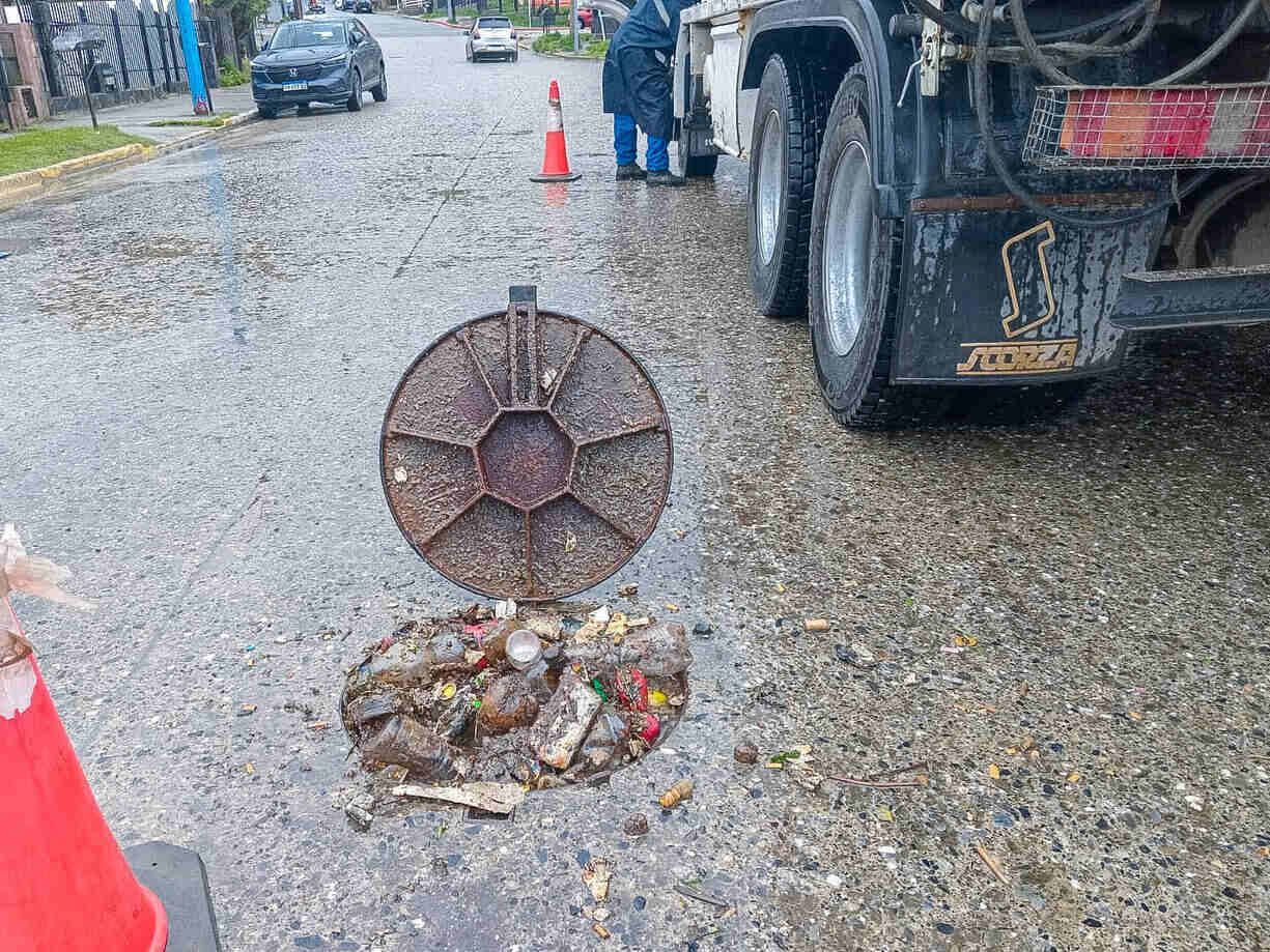 Los equipos del organismo realizan tareas sobre la red cloacal y brindan asistencia al Municipio de Ushuaia en el mantenimiento del sistema pluvial, con el objetivo de mitigar los efectos del temporal y restablecer el normal escurrimiento del agua.