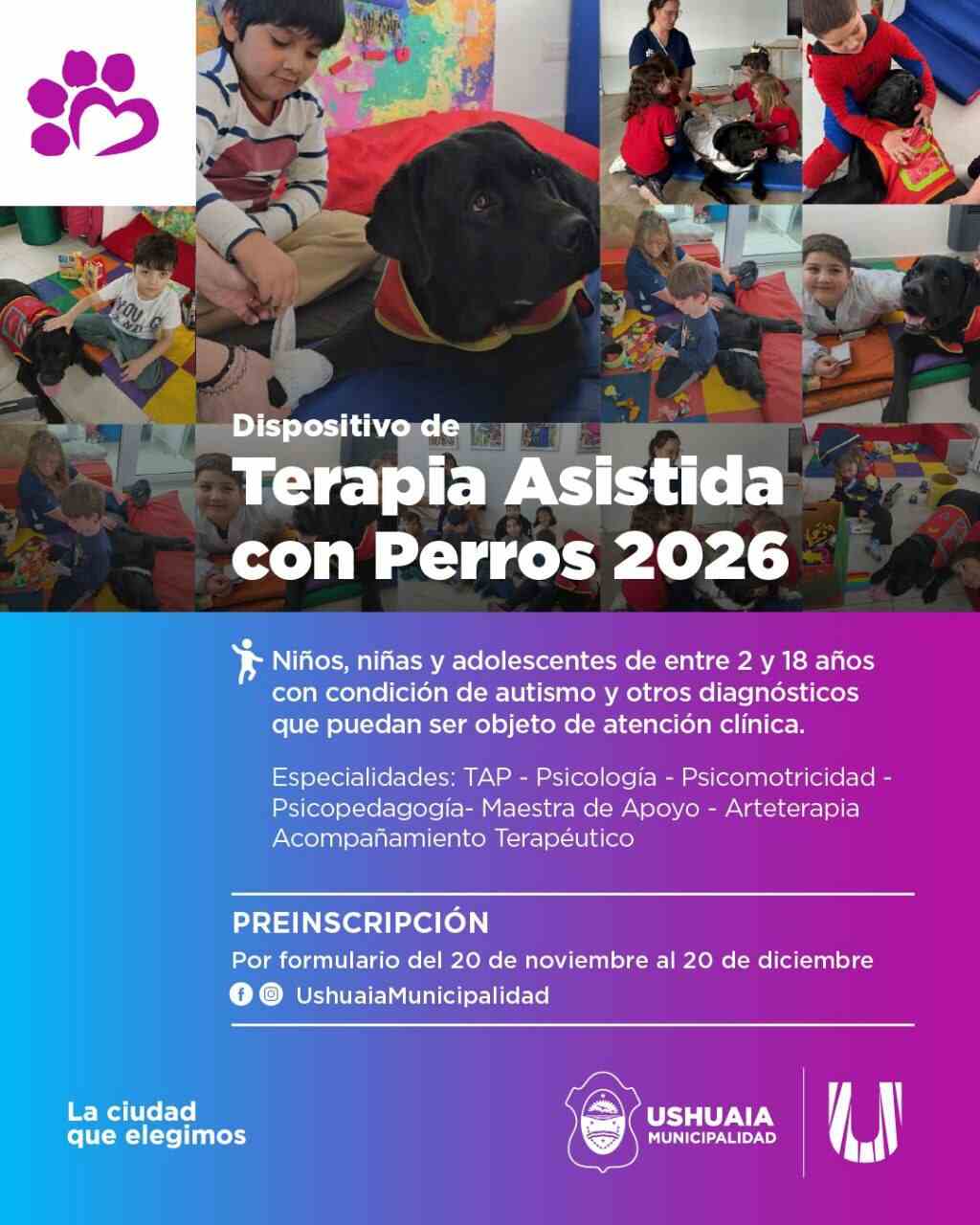 La preinscripción permanecerá abierta del 20 de noviembre al 20 de diciembre, a través de un formulario online disponible en las redes oficiales de la Municipalidad y en el siguiente enlace: https://inscripciones.website/terapia-asistida-con-perros-2026/