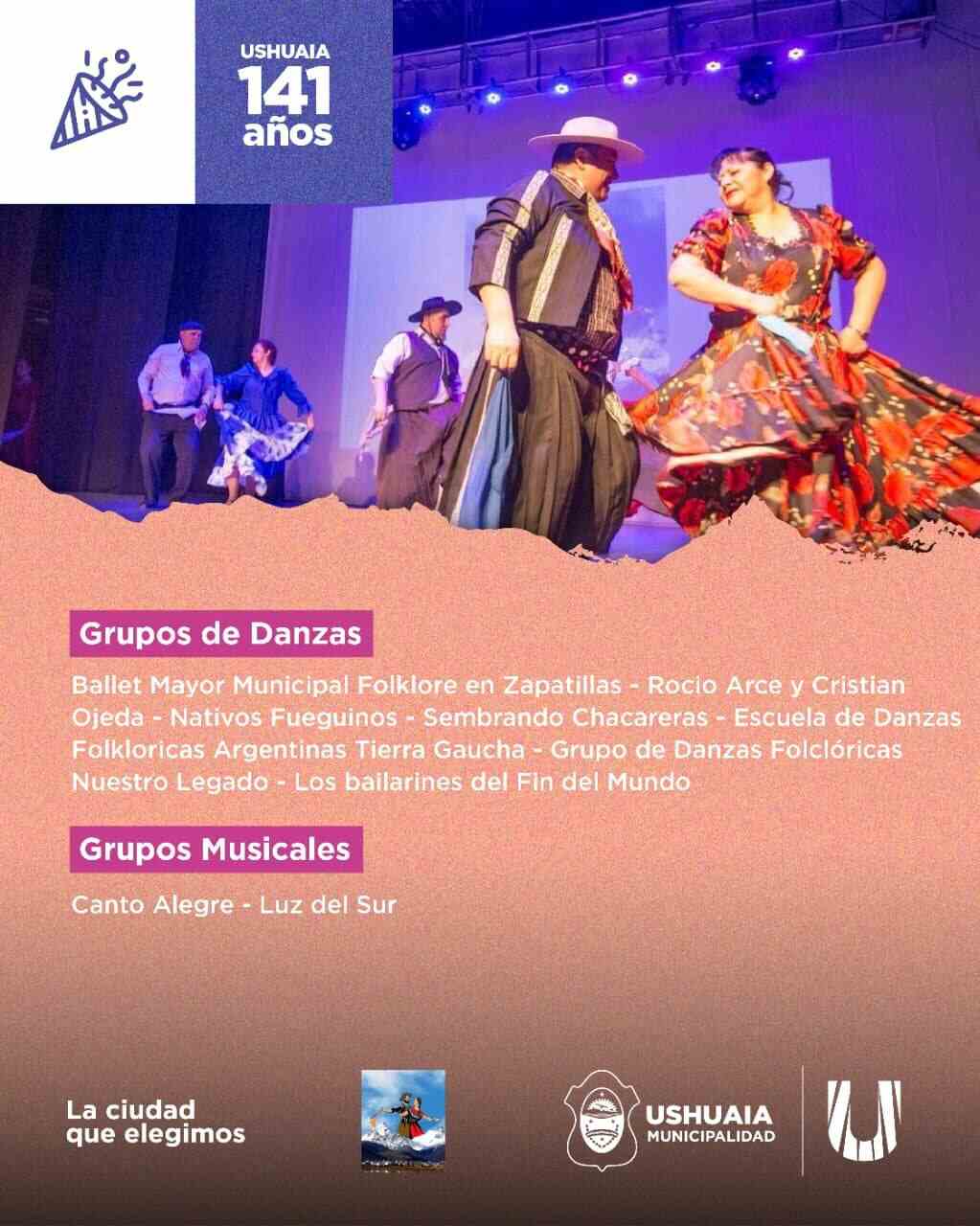 La propuesta, que será con entrada libre y gratuita, contará con la presentación de espectáculos de danza de los grupos Ballet Mayor Municipal Folklore en Zapatillas, Rocío Arce y Cristian Ojeda, Nativos Fueguinos, Sembrando Chacareras, Escuela de Danzas Folklóricas Argentinas Tierra Gaucha, Grupo de Danzas Folclóricas Nuestro Legado y Los Bailarines del Fin del Mundo, así como las presentaciones musicales de Canto Alegre y Luz del Sur. Amenizando la jornada habrá un servicio de buffet con platillos típicos.