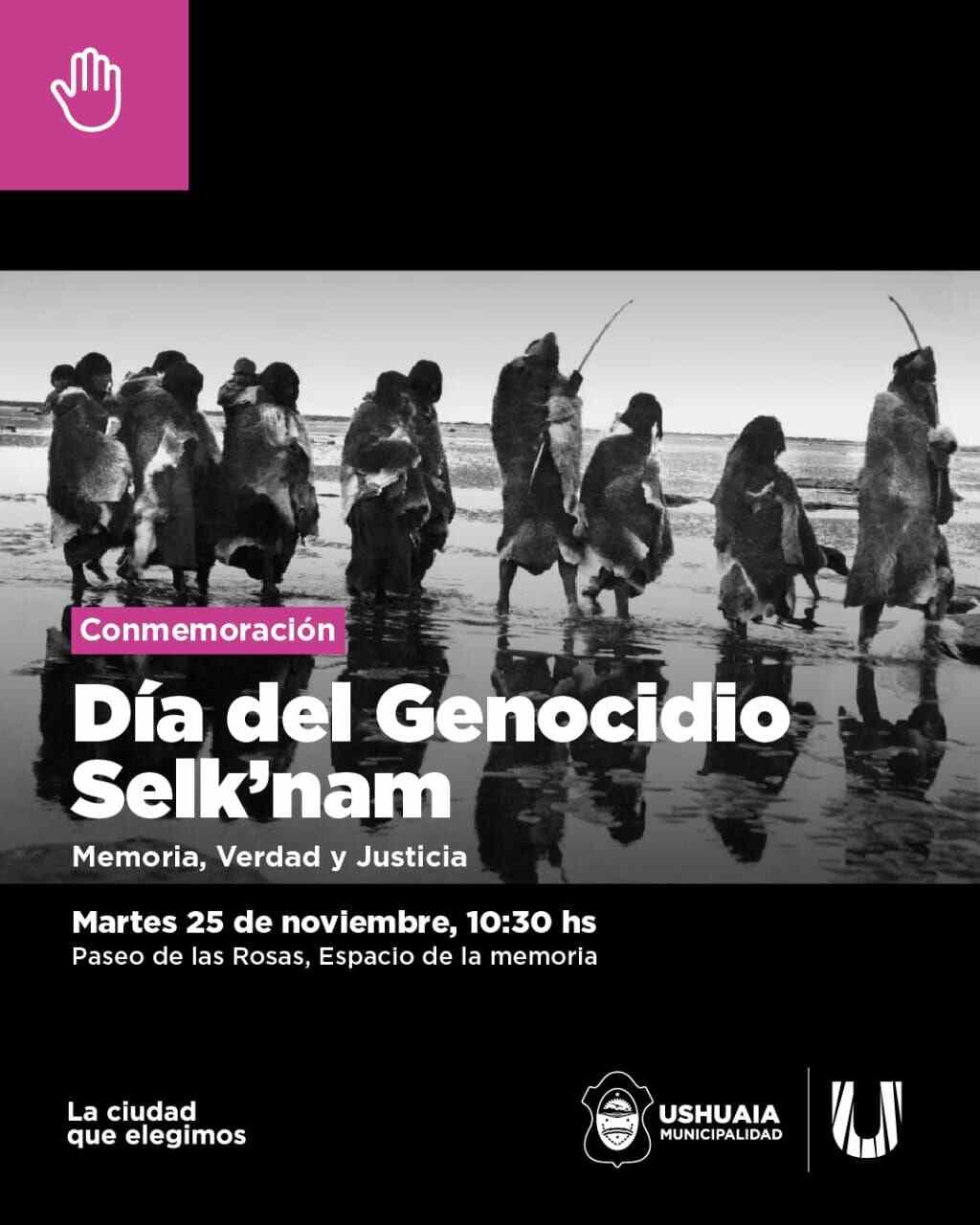 La Secretaría de Cultura y Educación de la Municipalidad de Ushuaia llevará adelante el acto en conmemoración por el “Día del Genocidio Selk'nam” este martes 25 de noviembre a las 10:30 horas, en el Espacio de la Memoria, ubicado en el Paseo de las Rosas. La ceremonia recuerda el genocidio de San Sebastián de 1886 contra el pueblo Selk'nam y busca izar las banderas de Memoria, Verdad y Justicia.