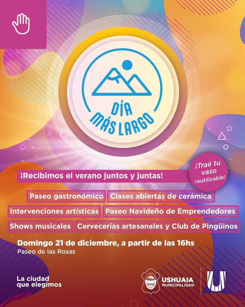 La Municipalidad de Ushuaia, a través de la Secretaría de Cultura y Educación, llevará adelante este domingo 21 de diciembre a las 16:00 horas el festejo por el “Día Más Largo” en el Paseo de las Rosas con diversas presentaciones musicales y actividades para toda la familia.
