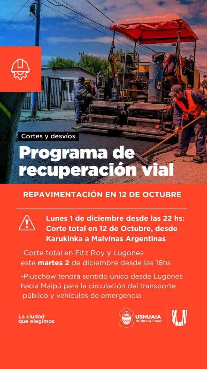 El lunes 1 de diciembre, desde las 22 horas se realizará un corte total de tránsito sobre la Avenida 12 de Octubre, entre Karukinka y Avenida Malvinas Argentinas, a fin de preparar la zona para las tareas posteriores.