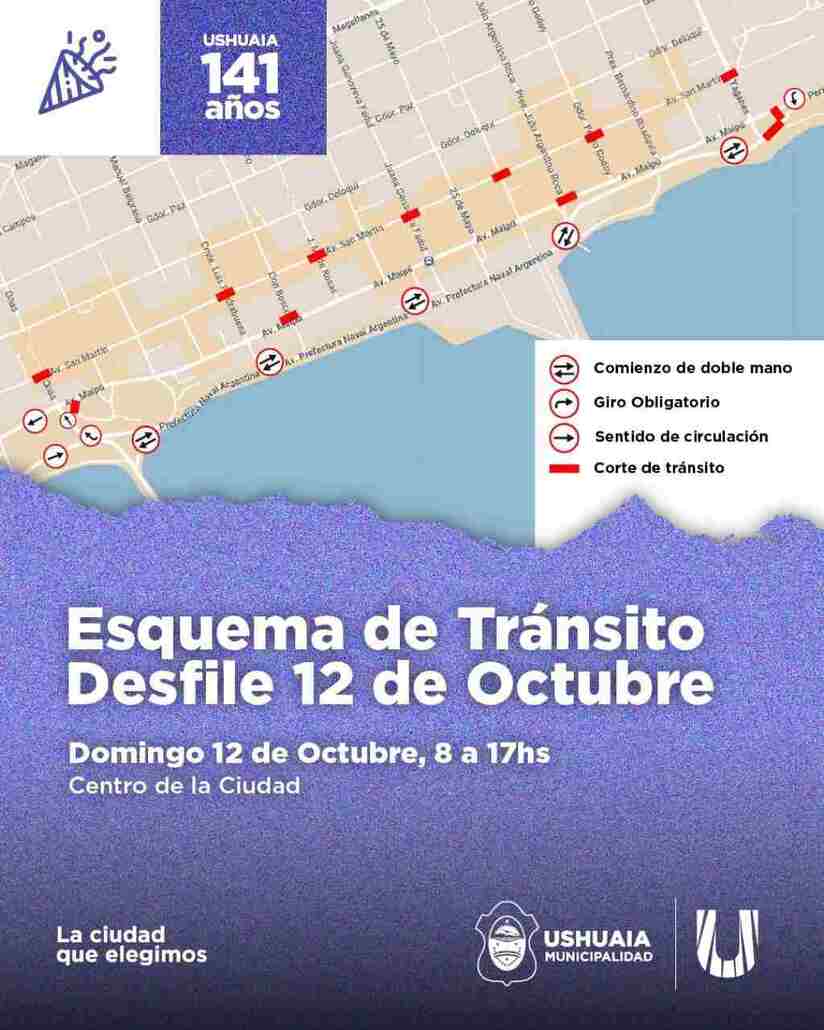 La Municipalidad de Ushuaia dispuso un esquema de tránsito para el día 12 de octubre en que se celebrará el 141° aniversario de la ciudad con el tradicional desfile. La avenida Maipú estará totalmente cortada al tránsito entre Yaganes y Onas desde las 8 hasta las 17 horas.