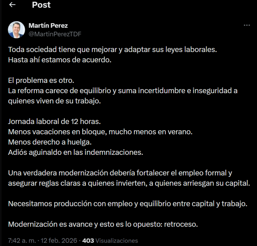 Desde sus redes sociales, Martín Perez, señaló que “Toda sociedad tiene que mejorar y adaptar sus leyes laborales. Hasta ahí estamos de acuerdo”. Pero advirtió que el debate no pasa por la necesidad de actualizar normas, sino por el rumbo que toman los cambios propuestos.