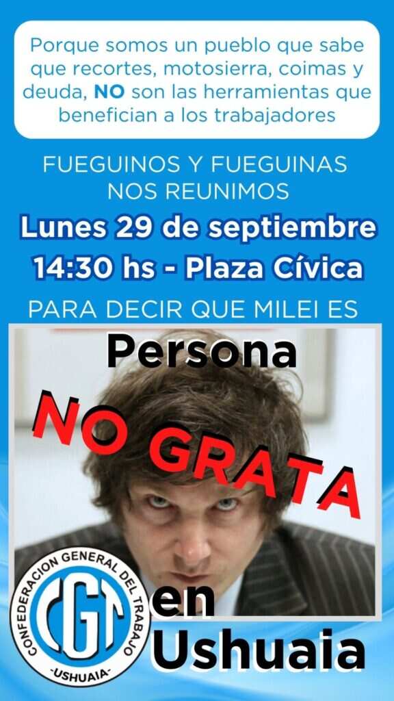 Por último, agregaron: “Porque somos un pueblo que sabe que recortes, motosierra, coimas y deudas no son las herramientas que benefician a los trabajadores. Fueguinas y fueguinos nos reunimos para decir que Milei es persona no grata en Ushuaia”.