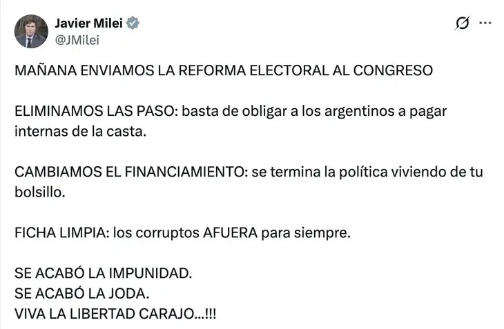 En un   mensaje publicado en su cuenta de X, el Presidente anunció que enviará  al Congreso una reforma electoral que incluirá la eliminación de las PASO y la incorporación de Ficha Limpia.