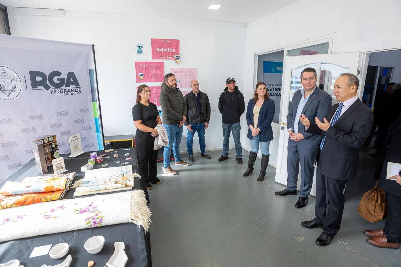 Durante la mesa de trabajo que se realizó en el Espacio Tecnológico, se hizo entrega de presentes protocolares elaborados por productores y emprendedores de Río Grande, con el propósito de que el diplomático y la comitiva que lo acompañaba puedan conocer el trabajo productivo que se lleva delante en la ciudad y el valor agregado que posee.
