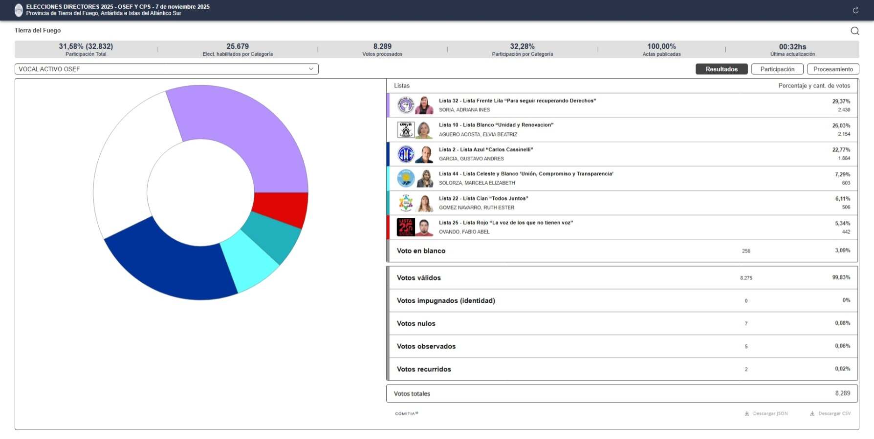 Vocal Activo OSEF: La Lista 32 - Frente Lila “Para seguir recuperando Derechos”, encabezada por Adriana Soria, se impone con el 29,51%