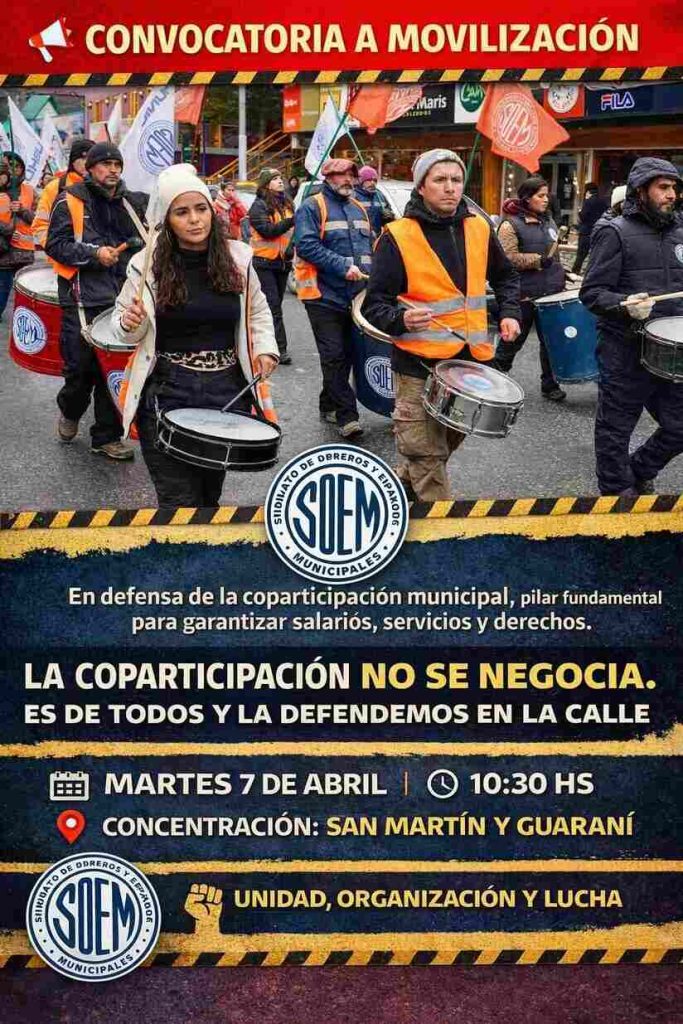 El Sindicato de Obreros y Empleados Municipales Ushuaia convocó a los afiliados a movilizar en defensa de la coparticipación municipal el martes 07 de abril a las 10:30h en San Martín y Guaraní.