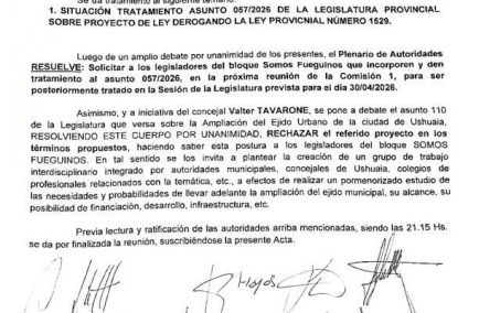 Los dirigentes además analizaron el asunto 110 de la Legislatura, de ampliación del ejido urbano de Ushuaia. A partir de la iniciativa del concejal Tavaroné, el plenario resolvió por unanimidad rechazar el proyecto en los términos propuestos.