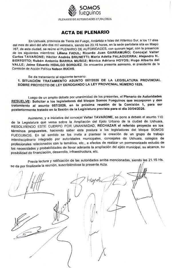 En un plenario de autoridades “Somos Fueguinos” rechazó el tratamiento de la ampliación del ejido urbano de Ushuaia y solicitar a sus legisladores el tratamiento de la derogación de la Ley Provincial N° 1529.