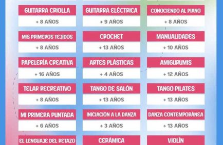 Además, se brindará Papelería Creativa, Artes Plásticas, Manualidades, Mi primera Puntada, Iniciación a la Danza, Danza Contemporánea, El lenguaje del Retazo, Cerámica y violín, entre otros. Las propuestas estarán dirigidas a distintas franjas etarias.