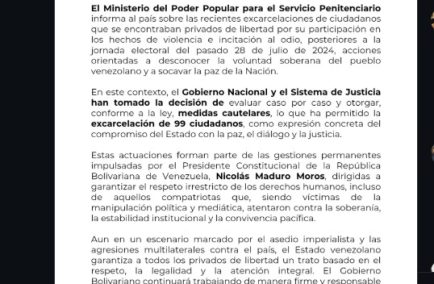 El Ministerio para el Servicio Penitenciario de Venezuela confirmó este jueves la liberación de 99 presos que habían sido detenidos tras las elecciones presidenciales de 2024. El anunció resalta “la excarcelación de 99 ciudadanos, como expresión concreta del compromiso del Estado con la paz, el diálogo y la justicia”